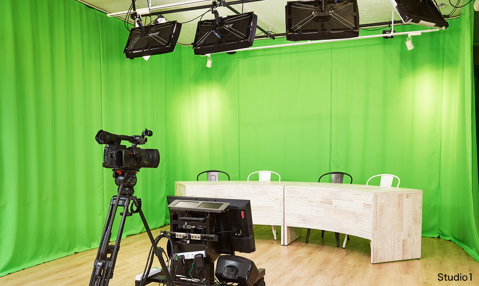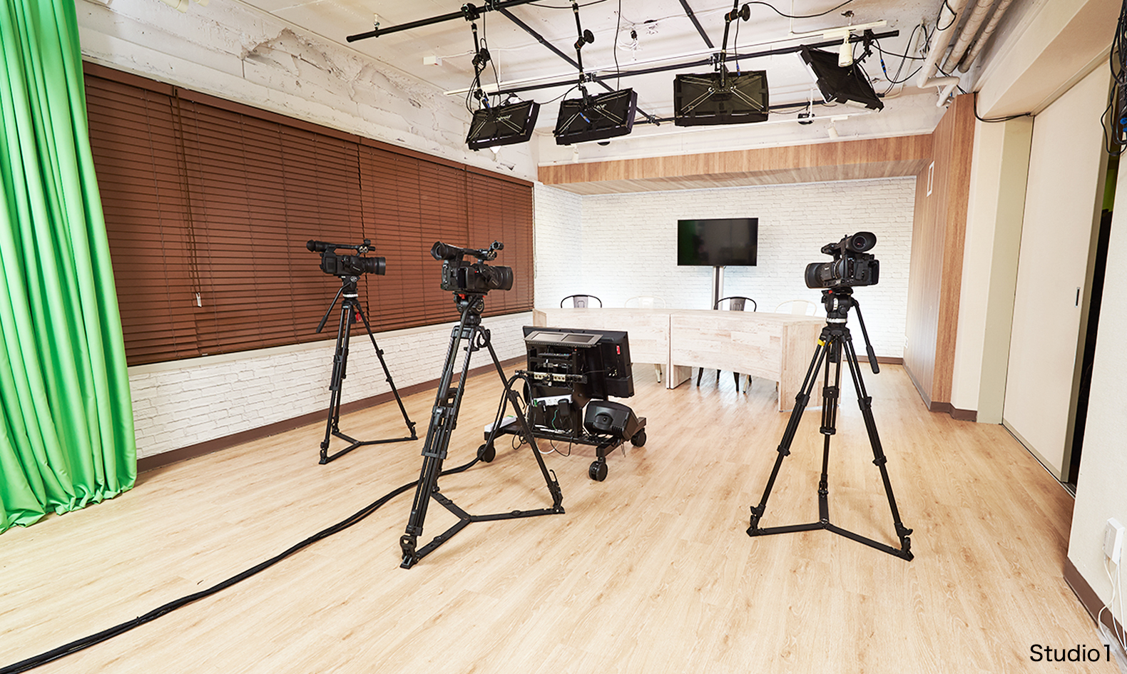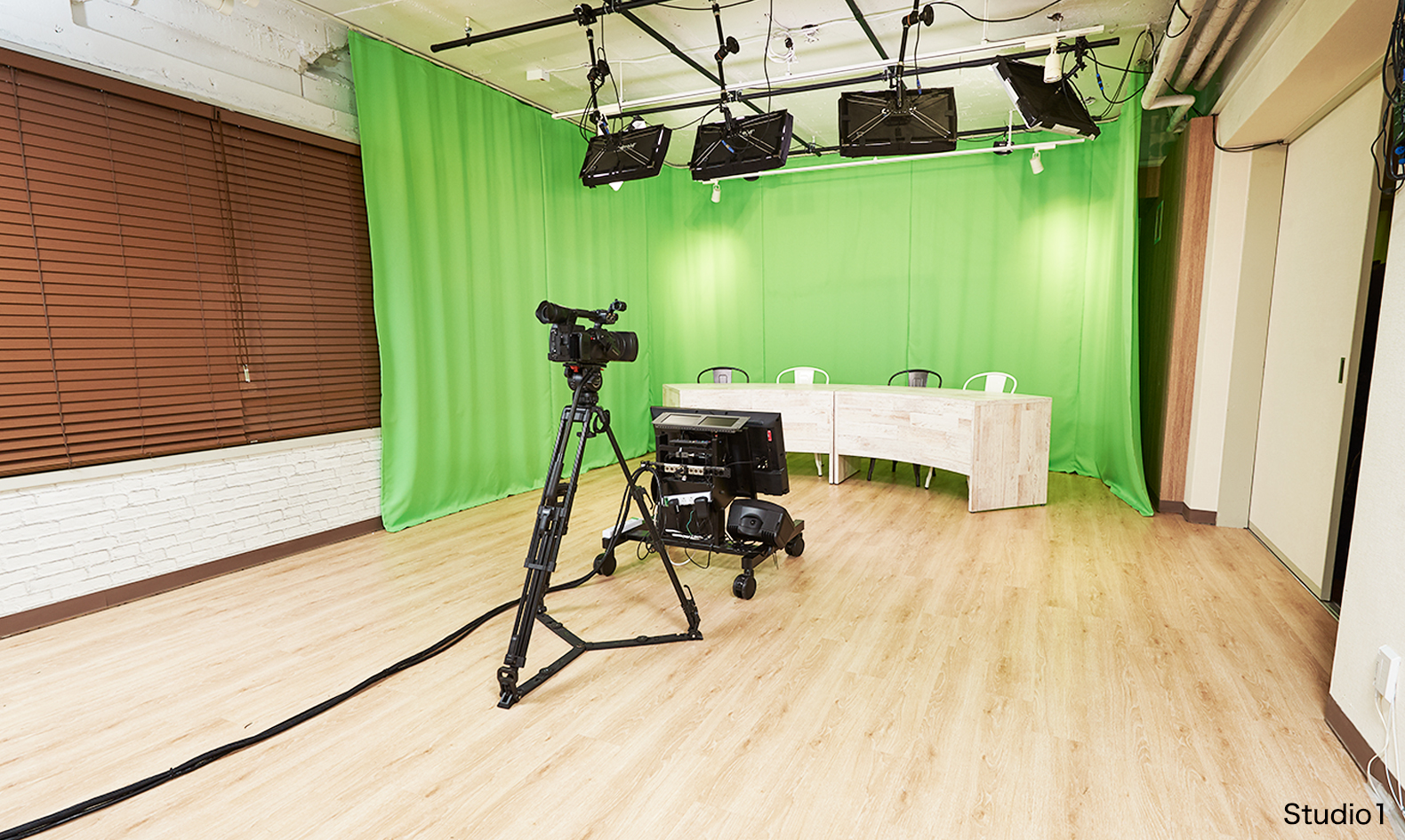 グリーンバックカーテンも常設になりますので合成配信も手間なく行えます。
